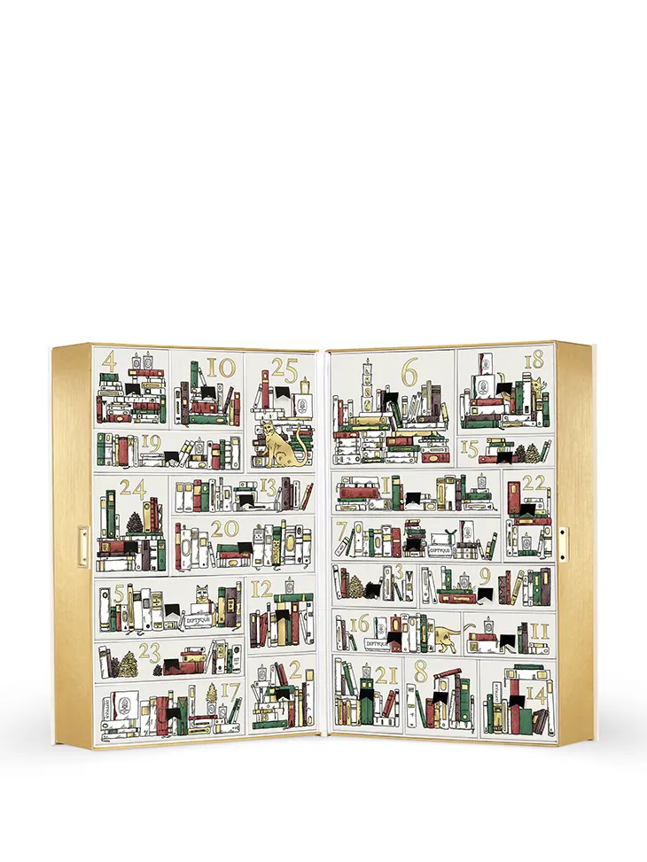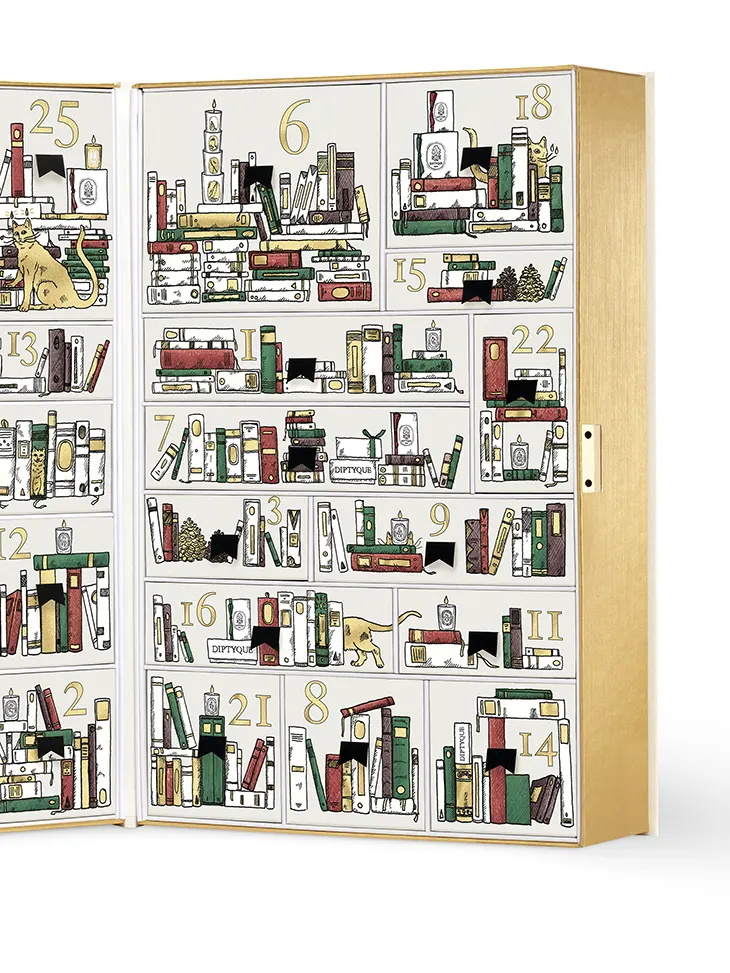 The Advent Calendar arrives shaped like a gilded book, its compartments revealing 25 surprises hidden among illustrated bookshelves and a mischievous cat. Another seasonal highlight, the Advent Taper Candle, counts down December’s days, its wax molded into the silhouette of a pine tree crowned with a flame. Decorative accessories echo the fairy tale theme: golden candle lids, porcelain trays, whimsical baubles, and a fantastical matchbox illustrated with pine motifs and a Parisian metro scene.