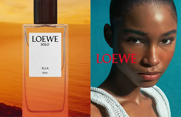 LOEWE Solo Ella Elixir appears within a horizon shaped by late sunlight, where the scene captures the quiet shift that follows a long, sun-exposed day. Its floral composition aligns with this softened light. LOEWE 001 Woman takes form through white rock formations shaped over time, connecting the fragrance to clean, mineral surfaces.