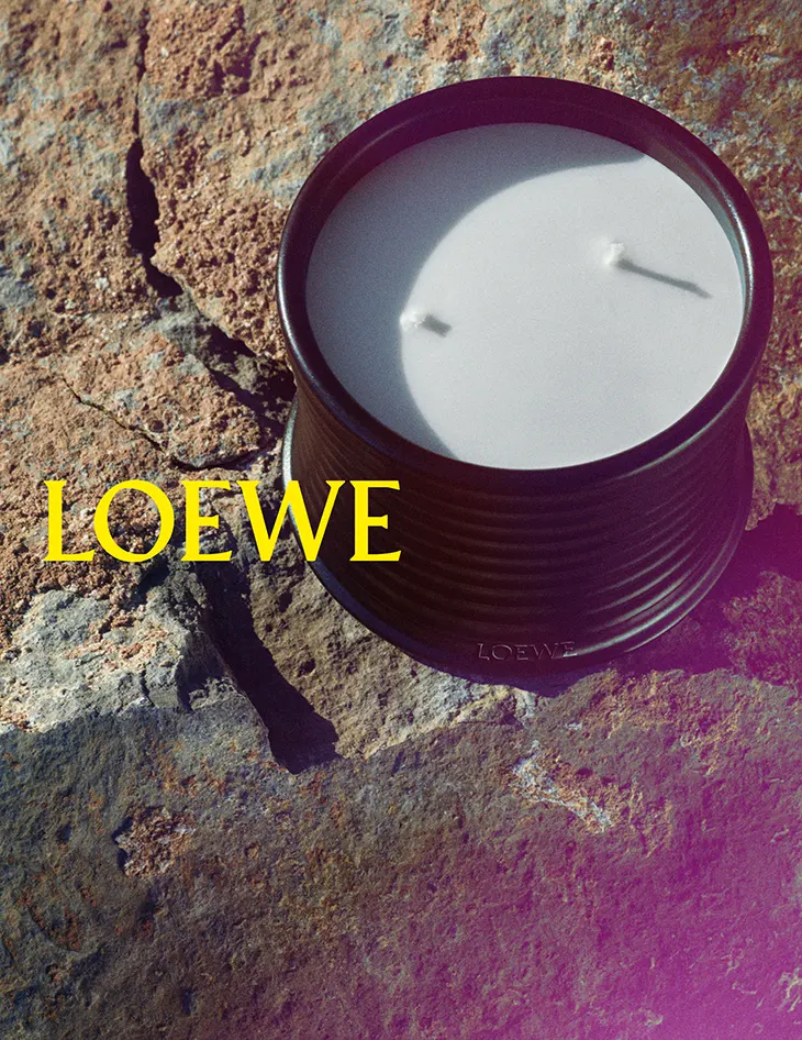 The campaign extends this approach through LOEWE Home Scents candles, each built around a single botanical note. The candles sit within natural surroundings, placed among rocks, sand, flowers, or vegetation.