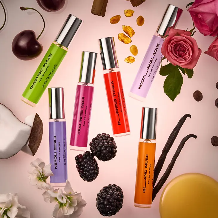Cherry Pulse opens with bright cherry and almond, elevated by rum and marshmallow for a playful edge. Rose, jasmine, and raspberry form a lush heart, settling into a warm base of tonka, wood, and vanilla musk. Neroli Silk brings a sunlit calm through coconut, neroli, and orange flower layered with solar vanilla, white musk, and soft woods. Praline Noir introduces richness with blackberry, cinnamon, praline, and ylang ylang, deepened by oud, chocolate, and vanilla bean.