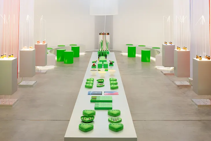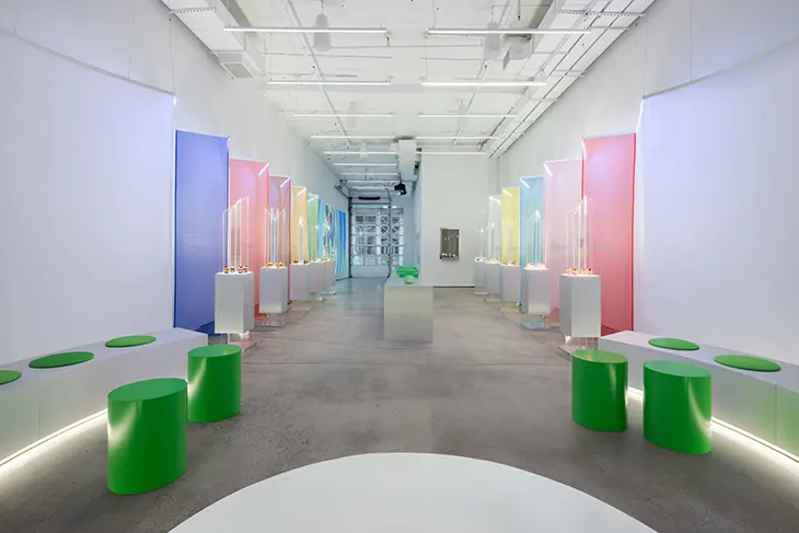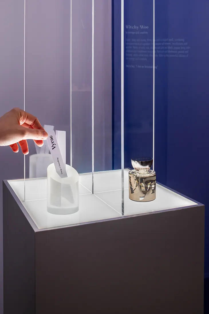 The pop-up interprets Vyrao’s ethos, “Energy is Everything,” as a spatial journey that organizes movement, light, and texture into rhythm. Within the structure of a former clothing store, AMO creates a layered environment where different zones move at varying tempos. A continuous soft curtain connects these areas, guiding guests through a sequence of transitions. At the entrance, a vibrant corridor pulses with projection and sound. Mirrors act as signage while amplifying the dynamic motion of visitors. The installation integrates totems, objects historically associated with sacred energy, to represent the elemental force of each Vyrao fragrance.
