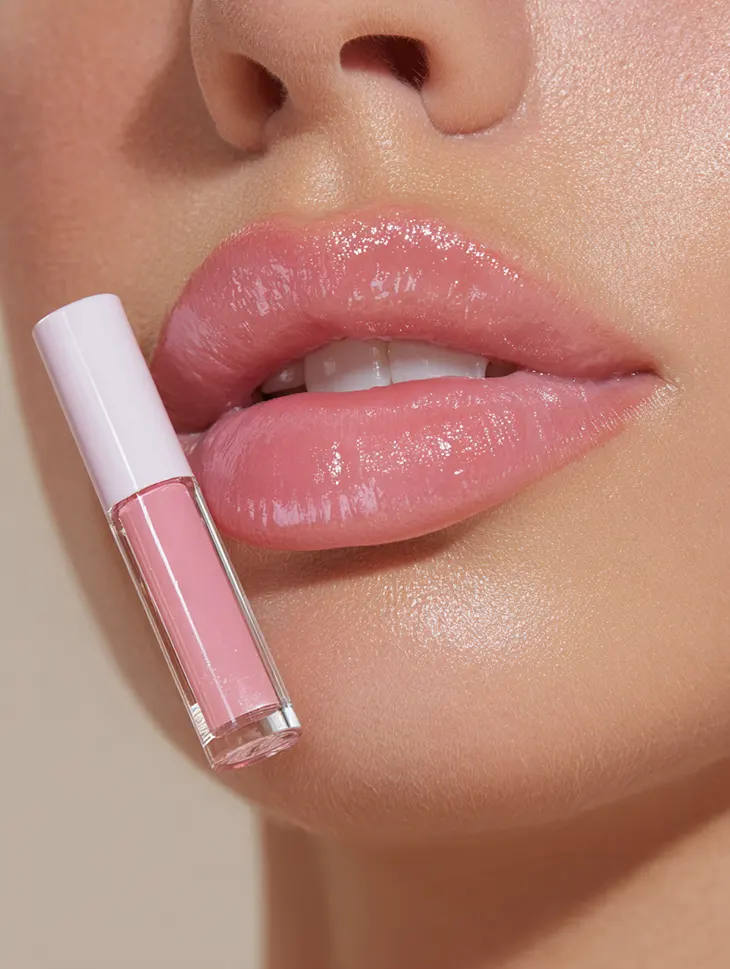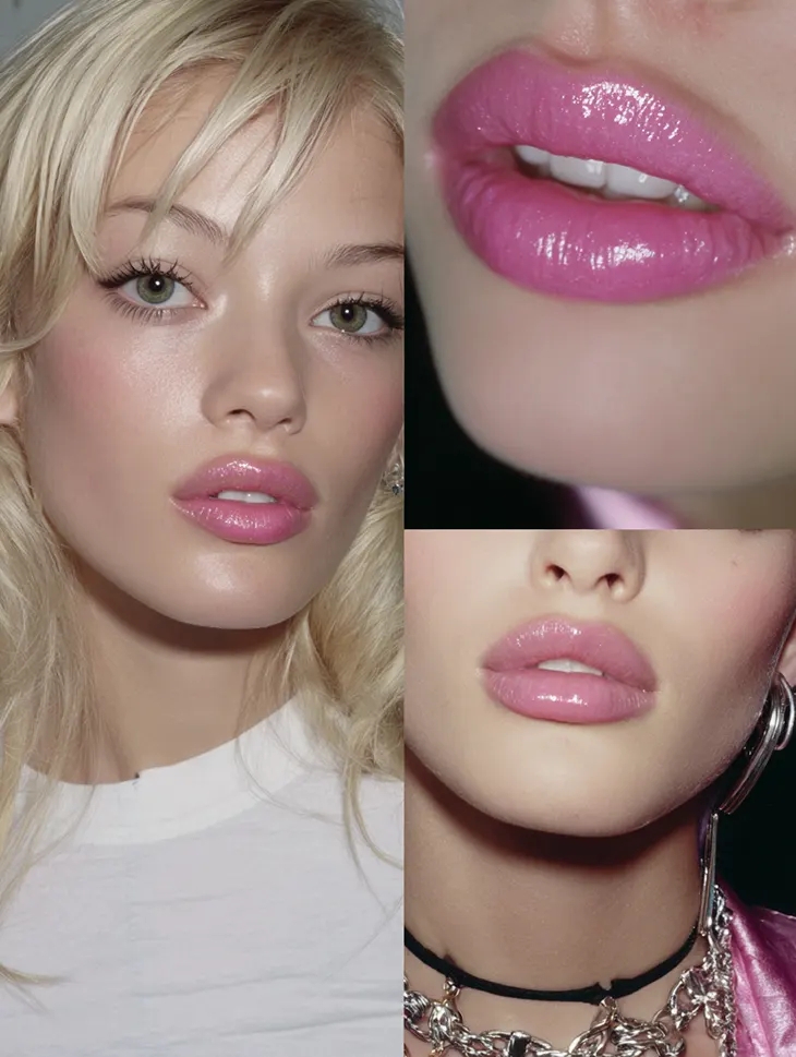 The signature Y2K lip is built on contrast and shine. A slightly deeper liner frames the mouth, while a softer, milky pink shade sits at the center. High-gloss finishes, clear or subtly tinted, give dimension and that signature wet look that defined early 2000s red carpets.