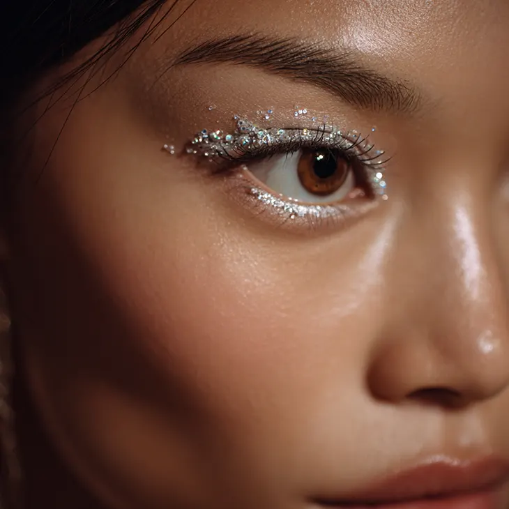 Crystals and embellishments still belong in the New Year’s Eve vocabulary, but placement matters. One or two stones at the outer corner, along the brow tail, or under the eye reads considered rather than costume. Adhesive matters more than quantity. When applied with precision, a single crystal can shift an entire look into evening territory without overwhelming it.