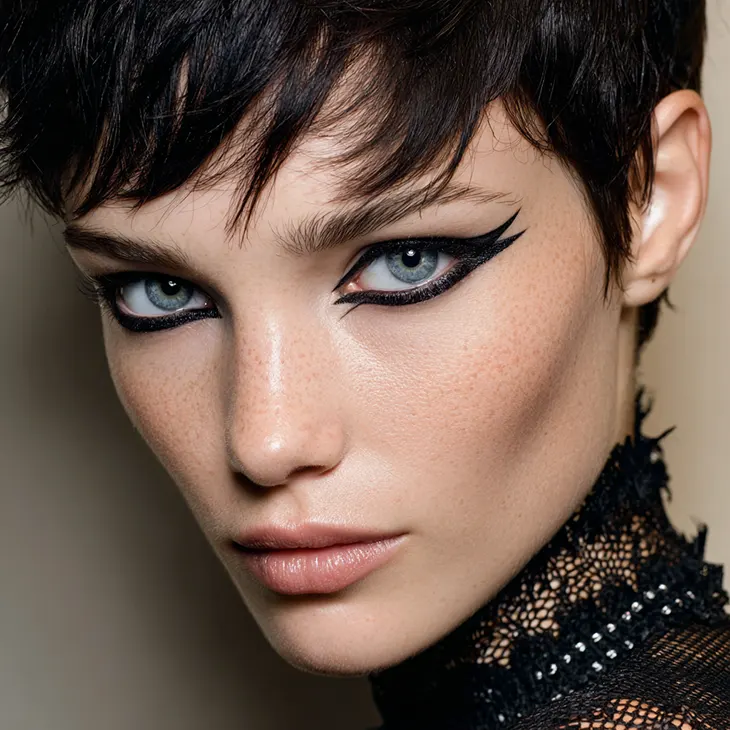 Graphic eyeliner continues to hold its ground, but New Year’s Eve pushes it further. Extended wings, floating shapes, or sharply cut inner corners replace traditional smokiness. Black still works, but deep brown, oxblood, and graphite feel more current. The rest of the face stays quiet so the line can read as design, not decoration.