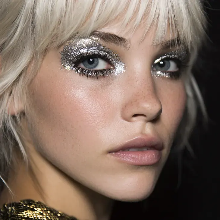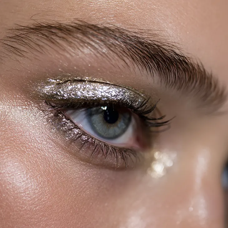 Forget throwback glitter or obvious disco references. Metallic eye makeup this year reads sharper and more architectural. Think liquid chrome finishes, brushed silver lids, or burnished gold pressed close to the lash line rather than blown out across the eye. The goal is density, not sparkle. A single reflective tone worn cleanly feels deliberate and modern, especially when paired with bare skin elsewhere.